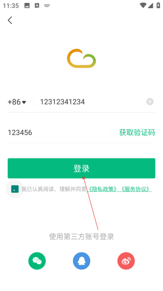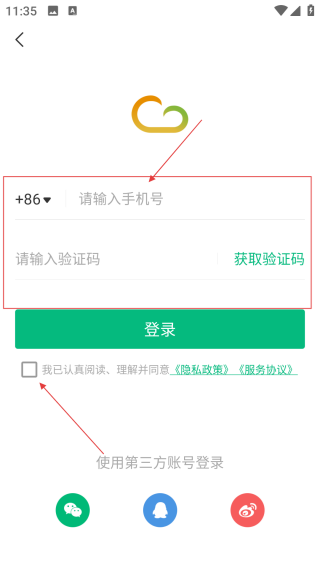 3、在账号登录界面,输入【手机号和验证码】,勾选【同意协议】。