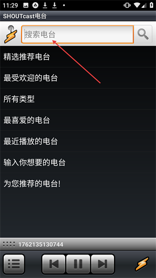 1、在SHOUTcast电台页面,可通过【搜索电台】框搜索电台,也可浏览【精选推荐电台】等分类查找电台。