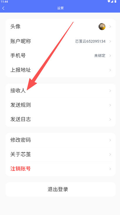 2、在设置按钮进入菜单页,选择“接收人”选项。