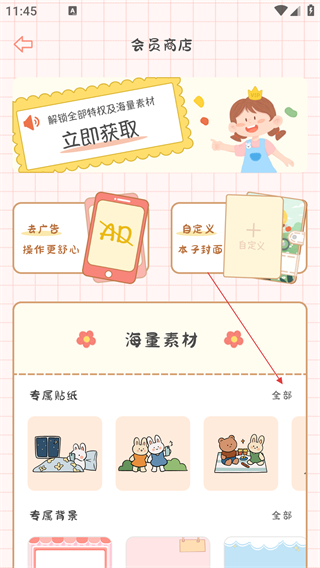 2、在会员商店页面,点击【专属贴纸】栏的【全部】选项,进入选择贴纸页面。