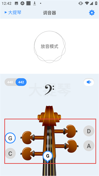 4、在大提琴调音界面,可查看G弦等琴弦的调音状态,进入放音模式辅助调音。