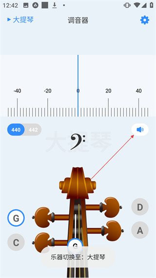 3、在大提琴调音器界面,点击喇叭图标可调节声音。