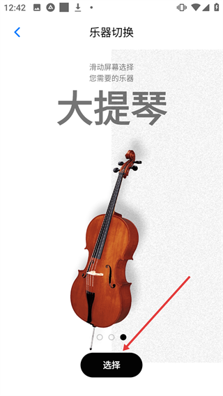 2、在乐器切换页面,选择【大提琴】后点击【选择】,切换为大提琴调音模式。
