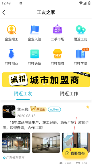3、在工友之家页面,点击【我要发布】按钮,进入发布界面。