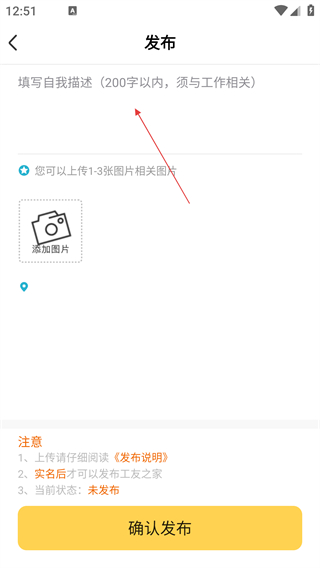 4、在发布界面,填写自我描述,可上传图片后点击【确认发布】按钮,完成发布操作。