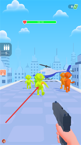 3、瞄准并射击绿色、橙色等敌人,消耗子弹消灭他们,推进关卡进度。