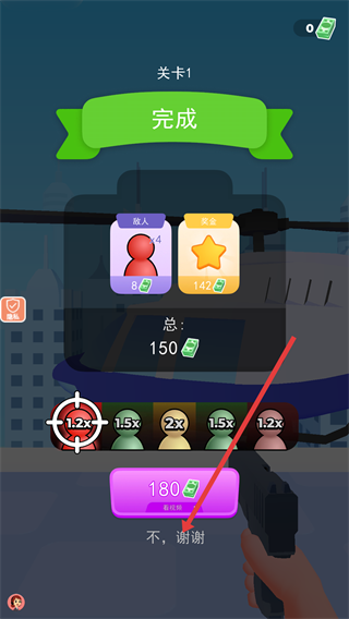 4、关卡1完成后,若不想观看视频,点击【不,谢谢】,结束当前关卡流程。