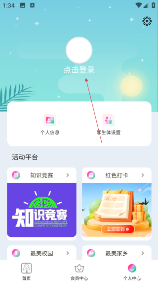 2、在个人中心界面,点击【点击登录】,进入登录选择界面。