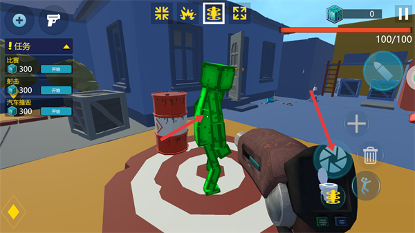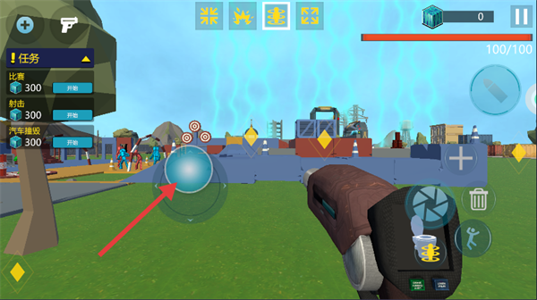 1、通过左侧虚拟摇杆控制移动,查看【比赛】【射击】【汽车撞毁】等任务,为后续挑战做准备。