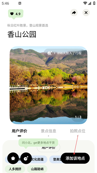 2、在景点详情页面,点击【添加该地点】按钮,进入加入行程页面。