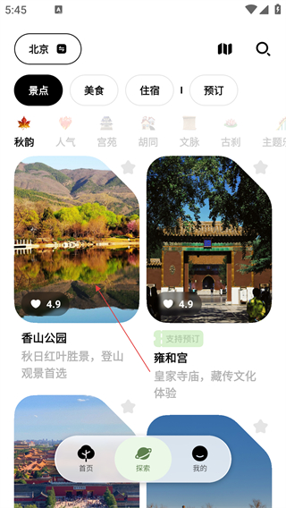 1、在探索页面,点击目标景点条目,如“香山公园”,进入景点详情页面。