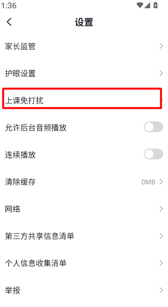 3、在设置列表中找到“上课免打扰”,打开该功能的管理页面。