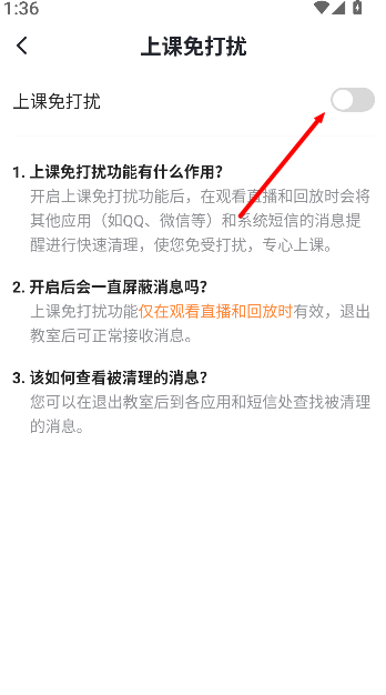 4、点击开关,将“上课免打扰”开启即可,使学习过程保持安静环境。