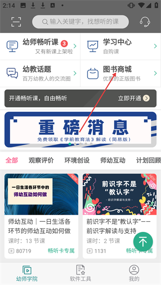 1、在幼师学院页面,点击【图书商城】进入图书购买页面。