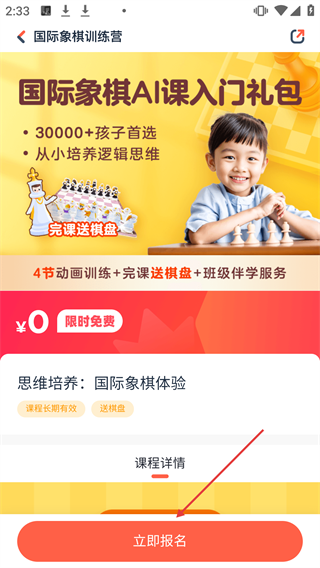 2、进入国际象棋训练营页面后,点击【立即报名】。