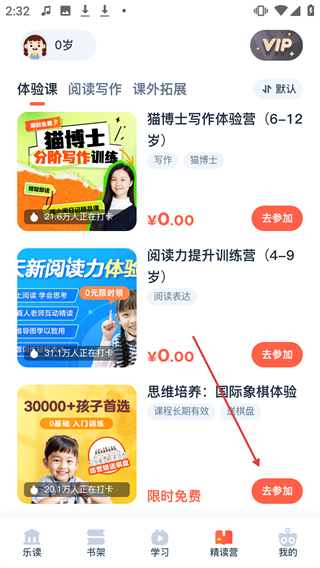 1、在课程列表页面,点击【思维培养:国际象棋体验】课程的【去参加】按钮。