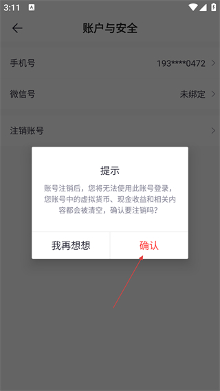 4、在提示框中,点击【确认】按钮,完成账号注销操作。