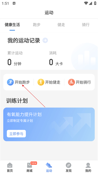 3、在运动功能页面,点击【开始跑步】选项,进入跑步记录页面。