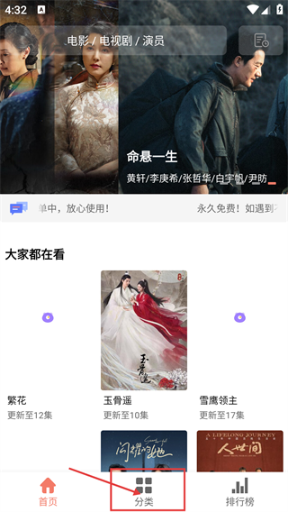 1、打开软件首页,可使用搜索功能查找电影、电视剧浏览【大家都在看】的推荐内容,点击底部【分类】进入分类页面。