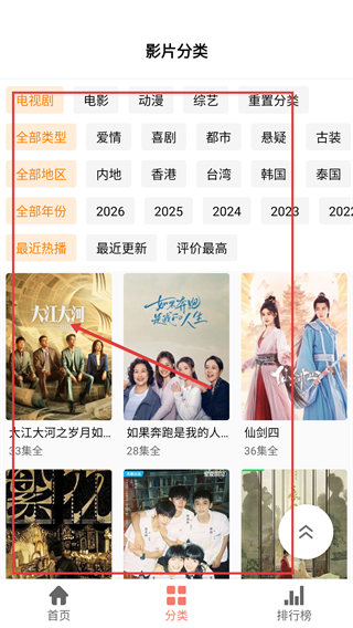2、进入分类页面后,可选择【电视剧】【电影】等影片类型,筛选,如《大江大河之岁月如歌》影视作品。