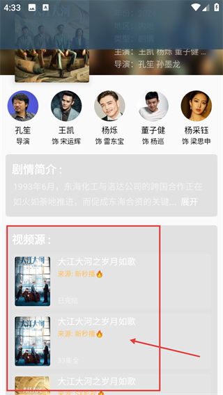 3、点击影视作品进入详情页,可查看主演、导演、剧情简介等信息,选择合适的【视频源】,进入播放页面。