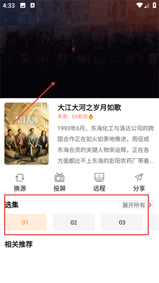 4、进入播放页面后,可使用【换源】【投屏】【分享】等功能,选择【选集】观看对应集数,还能查看相关推荐内容。