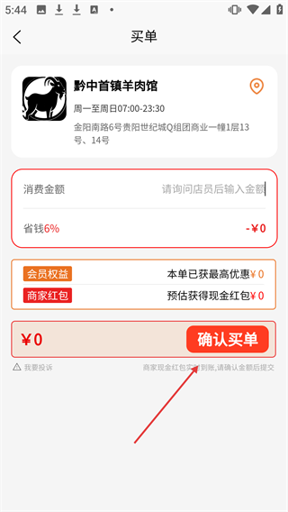 4、在买单页面,输入消费金额后点击【确认买单】完成买单操作。