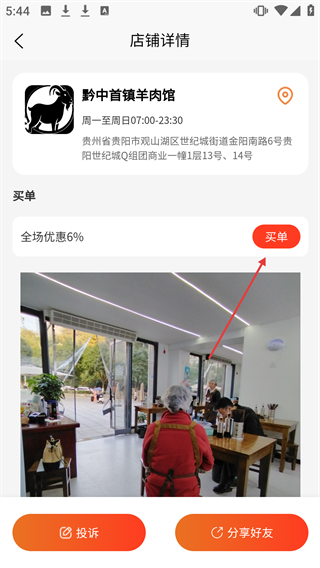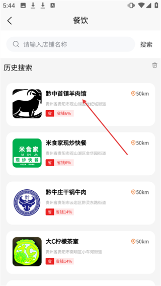 2、在餐饮店铺列表页面,点击【黔中首镇羊肉馆】进入店铺详情页。
