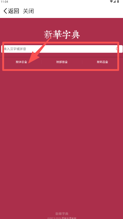 3、进入字典界面后点击“按拼音查”按钮输入汉字进行查询。