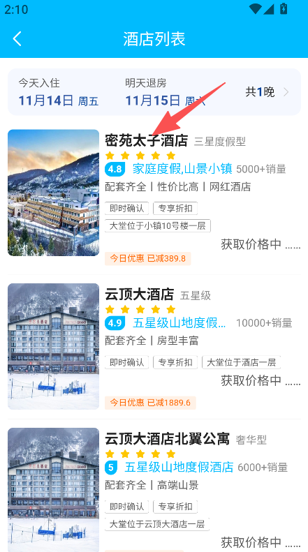 1、打开软件,点击酒店板块,浏览酒店列表(如密苑太子酒店)。