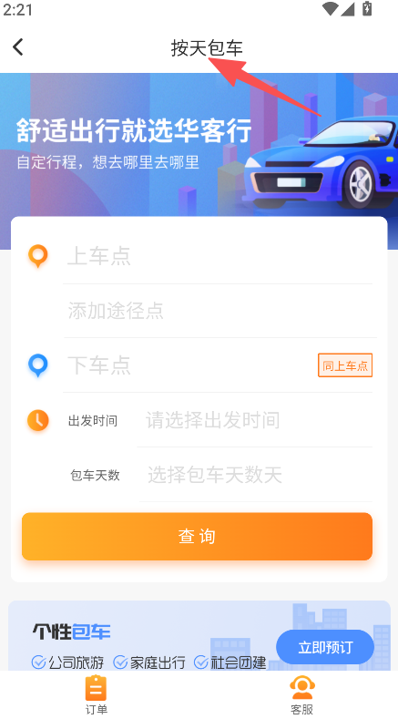 1、进入按天包车板块,设置上车点、下车点,选择出发时间及包车天数,点击查询。