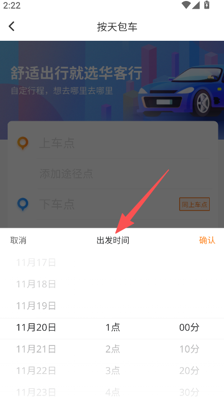 2、时间选择功能,在出发时间界面可选择具体日期和时刻,精确把控出行时间,确保包车服务按时提供。