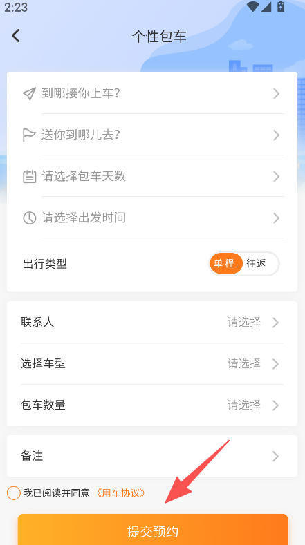 3、进入个性包车板块,填写行程、联系人、车型等信息,勾选协议后提交预约。