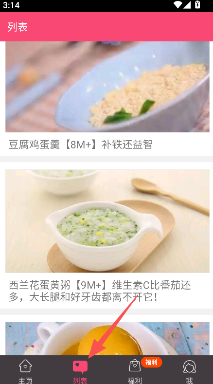 1、进入列表板块,浏览不同月龄的宝宝辅食食谱。