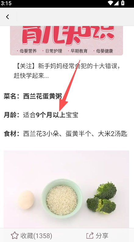 2、点击食谱,查看适合月龄、食材(西兰花、蛋黄等)。