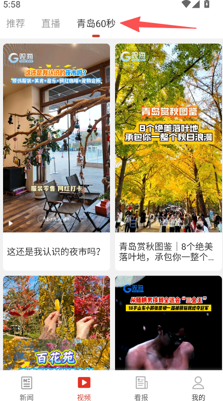 2、视频观看功能,在青岛60秒板块查看本地特色短视频,如夜市、赏秋内容,直观感受青岛城市风貌。