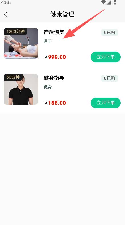 1、进入健康管理板块,选择产后恢复项目。