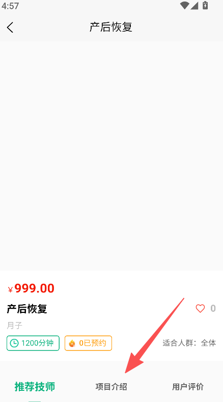 2、查看产后恢复项目的价格、时长及适合人群。