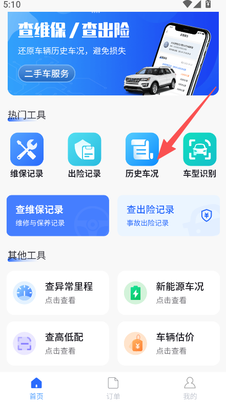 2、工具组合多样,除核心车况查询工具外,还有查异常里程、新能源车况、车辆估价等工具,全方位助力用户了解车辆状况。