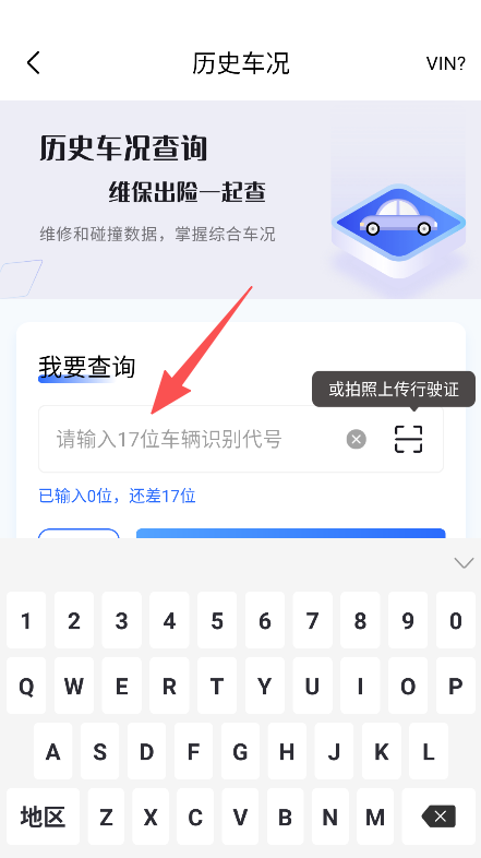 2、输入17位车辆识别代号或拍照上传行驶证。