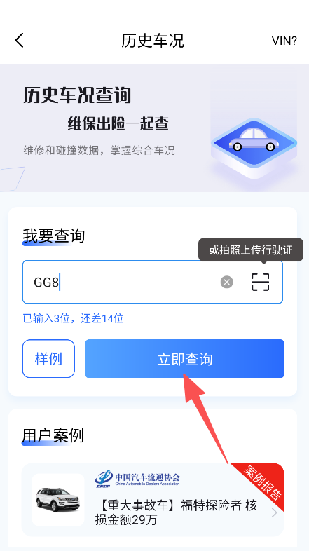 2、操作简便,用户输入车辆识别代号或拍照传行驶证即可快速查询车况,降低使用门槛,提升查询效率。