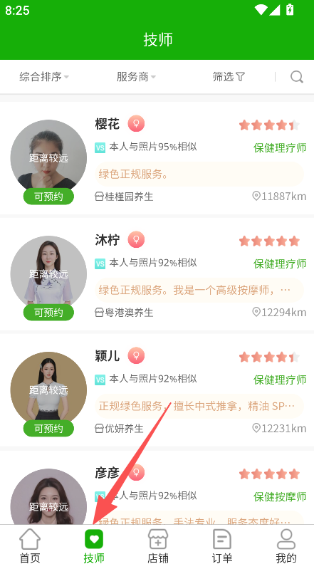 2、技师信息展示清晰,包含相似度、服务商家、可预约状态等,让用户全面了解技师情况,便于选择。