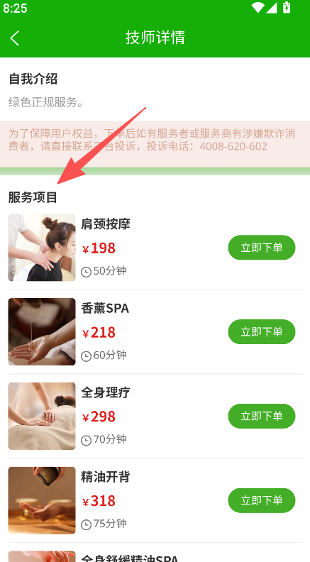 2、可查看技师服务项目,了解项目价格、时长,选择后立即下单,启动按摩服务流程。