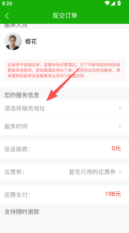 3、进入提交订单页面,选择服务地址、时间,完成订单提交。