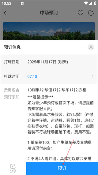 4、在预订信息页面确认打球日期、时间、费用包含等信息后,点击【预订】完成操作。