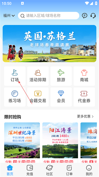 1、在软件首页,找到【订场】功能入口,点击进入可查看各类球场预订选项。
