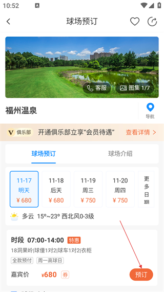 3、选定球场后,在球场预订页面选择打球日期及时段,点击【预订】按钮进入下一步。