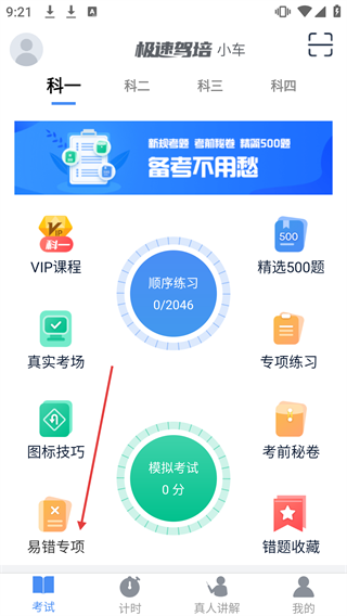 1、在极速驾培小车科一页面,点击【易错专项】进入易错专项分类页面。