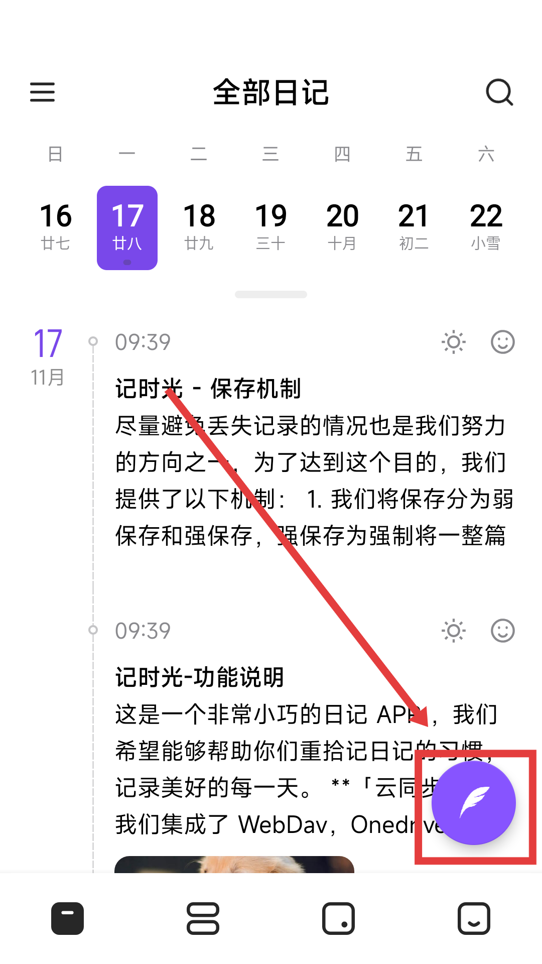 1、在全部日记页面,点击右下角紫色羽毛按钮,可进入日记编辑页面,准备记录新的日记内容啦。