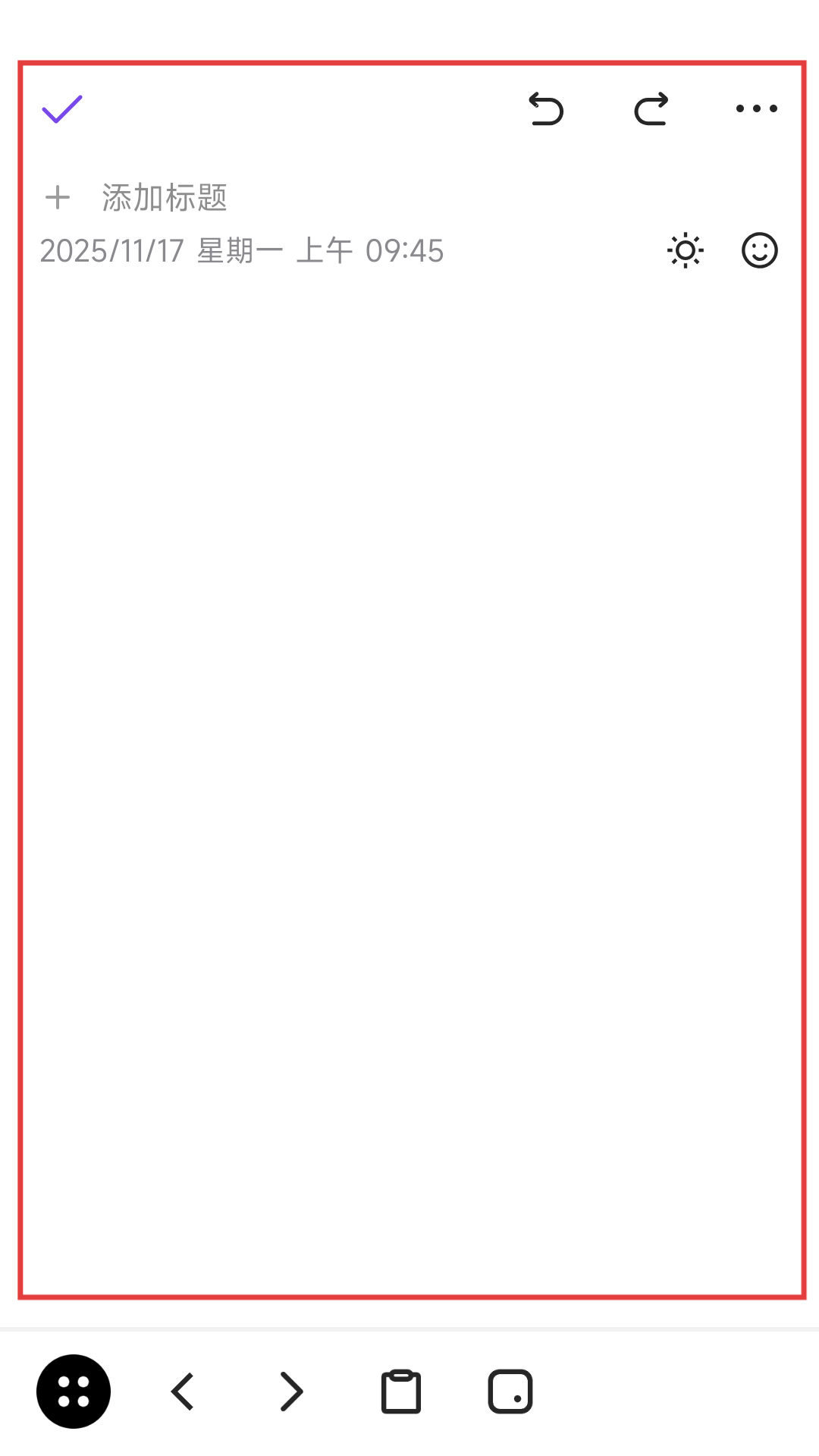 2、进入日记编辑页面后,可添加标题、记录内容,还能设置天气、心情等,丰富日记记录哦。